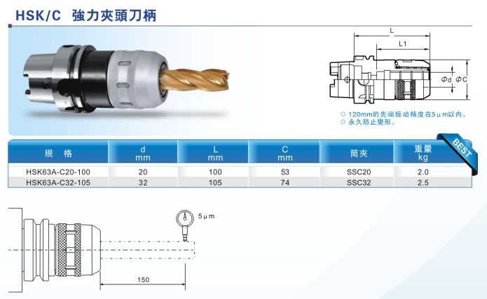 HSK强力刀柄特点:夹持部加厚设计,提高刚性,防止振动;夹持力强,跳动精度高。